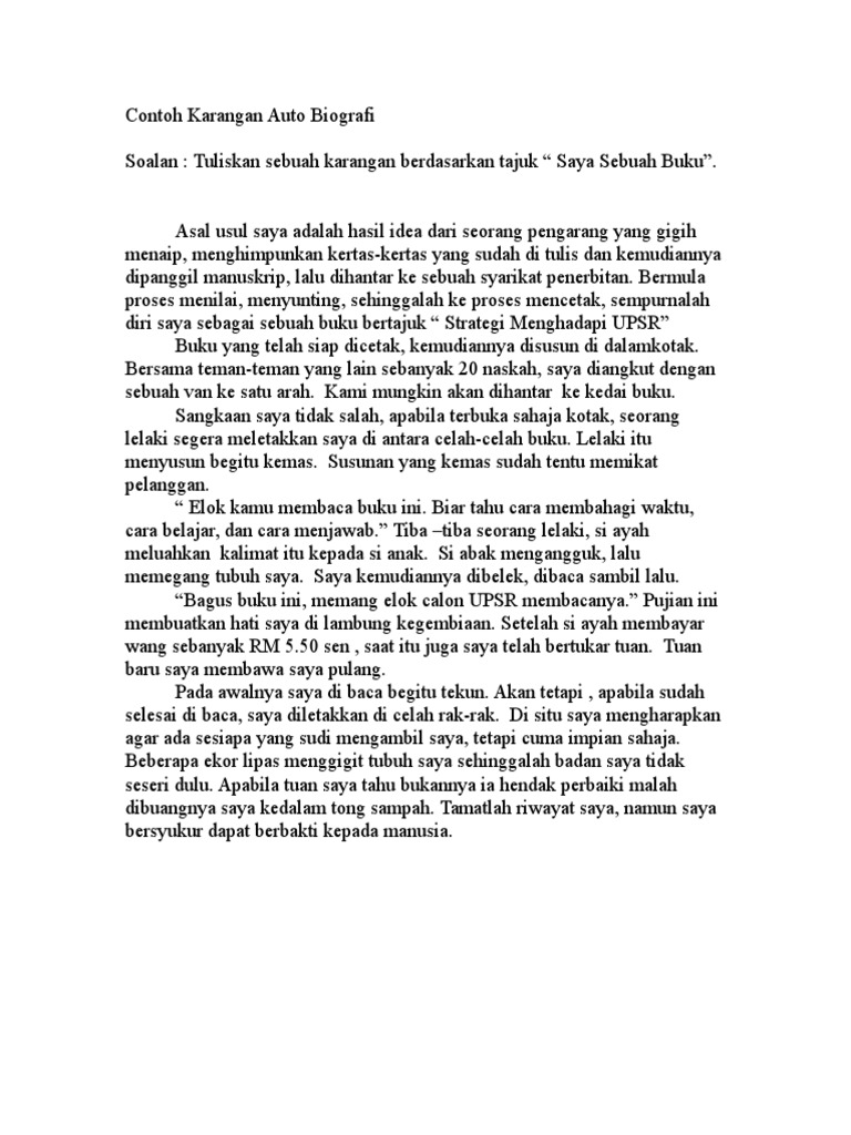 Contoh Karangan UPSR Karangan Jenis Biografi - Kehidupan Seharian Seorang Penoreh Getah Karangan jenis ini mengisahkan perihal riwayat hidup orang lain dari mula hingga ke akhir antaranya. Ni just contoh dalam bahasa melayu ja.